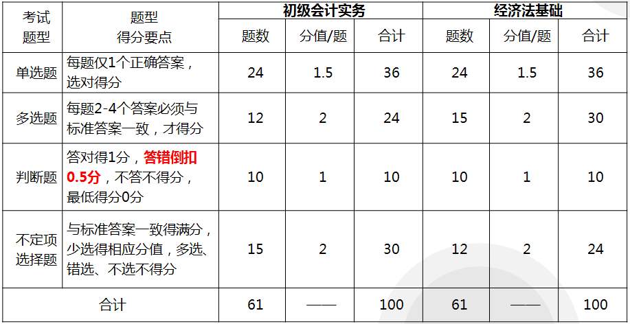 《初級會計實務》單選題24個,分值為36分;多選12個,分值為24分;判斷題為10個,分值10分;不定項選擇15個,分值30分。