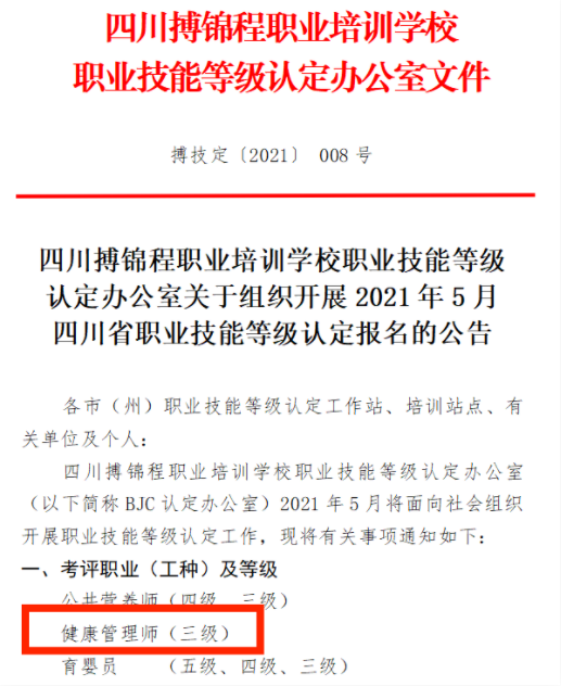 根據四川搏錦程職業培訓學校發布考試通知:2021年四川健康管理師報名時間截止時間:5月14日,小伙伴們快快抓緊時間行動起來吧!詳情如下:
