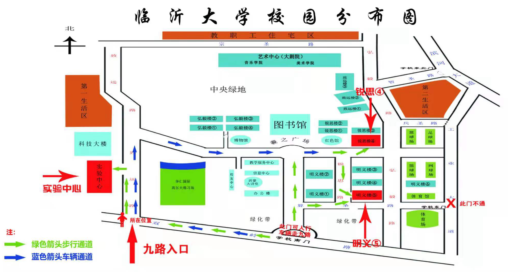 乘機動車自行前往各考點的考生,車輛嚴禁進入校園,送考人員和車輛應做到即停即走,嚴禁在考點入口處聚集。考場設在臨沂市技師學院(北校區)的考生,由臨沂市蘭山區通達路18號西門步行進入校園??紙鲈O在山東醫學高等??茖W校的考生,由臨沂市蘭山區聚才六路與濱河路交會處南門步行進入校園。因工業大道(濱河路-雙嶺路)正在進行道路施工,臨沂大學東1門、東2門關閉??紙鲈O在臨沂大學弘毅樓的考生,建議由臨沂大學西南門(雙嶺路和臨西九路交會處)步行進入校園,到達考點教學樓約需15分鐘左右??紙鲈O在銳思樓、明義樓的考生建議由臨沂大學南門(雙嶺路和宏大路交會處)步行進入校園,到達考點教學樓約需10分鐘左右。