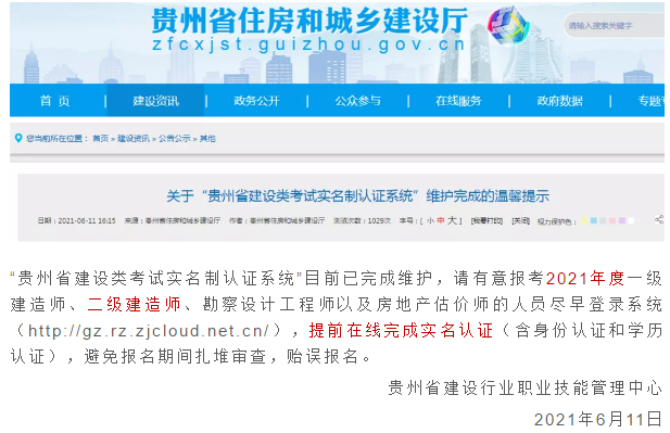 自2021年5月30日起,因系統維護,報考人員身份認證暫停受理。系統完成維護后,我中心將第一時間推送恢復受理的通知,請報考人員關注“貴州省住房和城鄉建設廳”網站及“貴州建設人才”微信公眾號。身份認證已完成的報考人員不受影響,可直接在線提交辦理學歷認證。