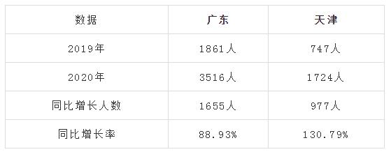 上面是分析了通過率,緊接著以廣東、天津這兩個地區為例,對2019年和2020年一造合格人數變化情況進行分析:
