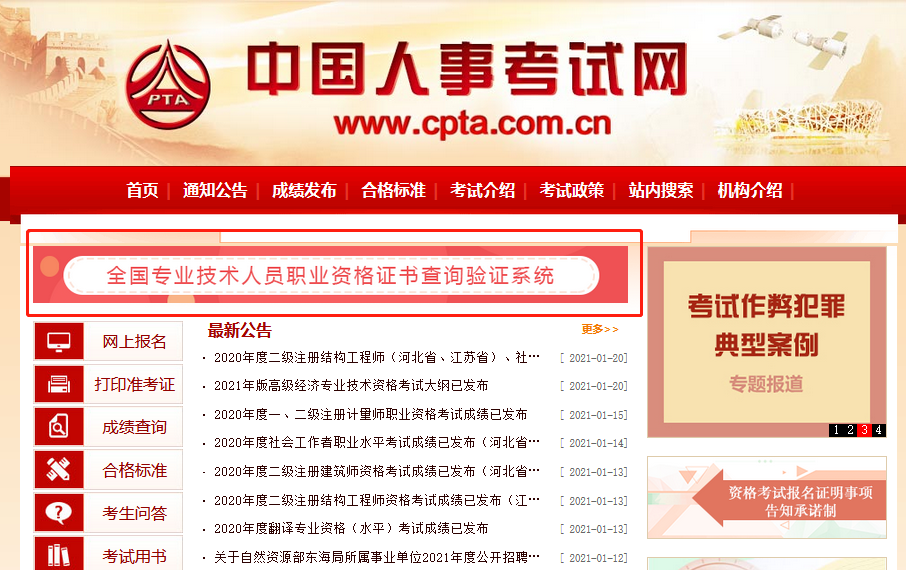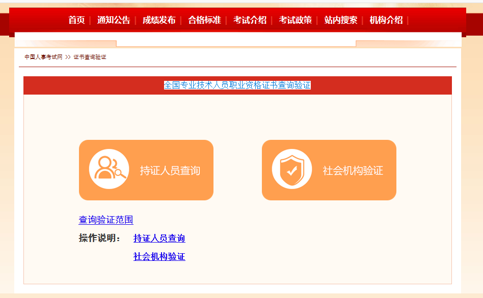 進入中國人事考試網,點擊【全國專業技術人員職業資格證書查詢驗證】。