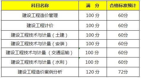 即《建設工程造價管理》《建設工程技術與計量》《建設工程計價》和《建設工程造價案例分析》四個科目的合格標準分別為60分、60分、60分和72分(相應科目試卷滿分分別為100分、100分、100分和120分)。
