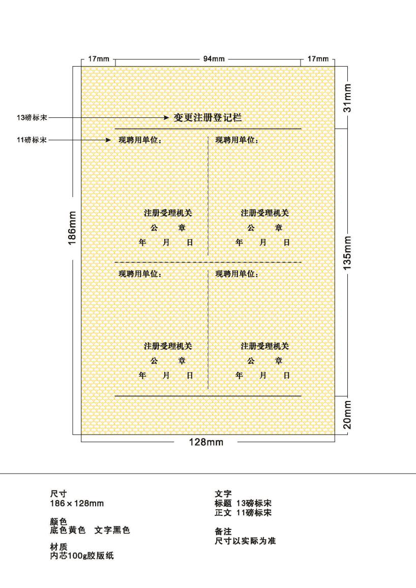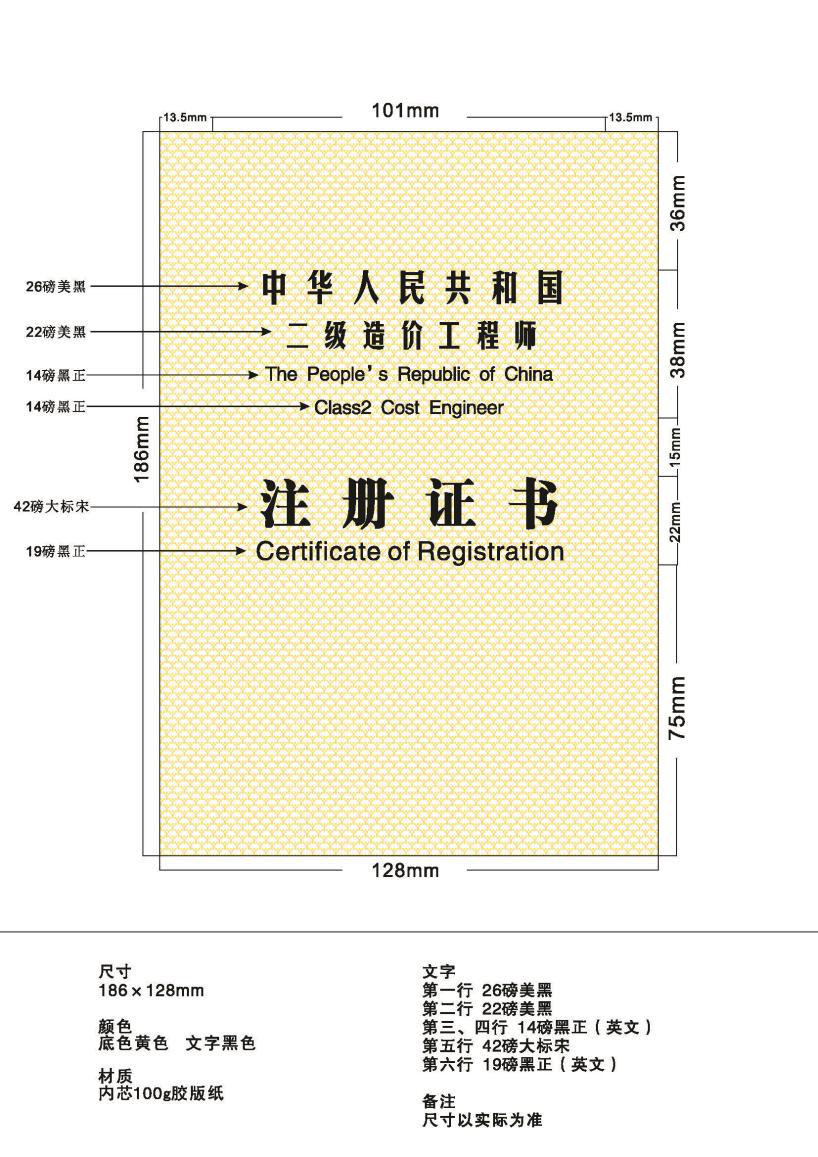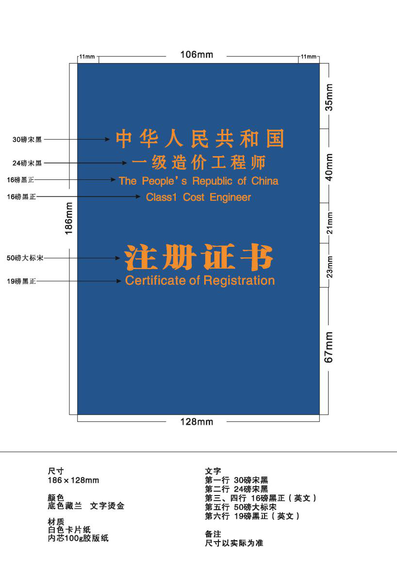 (三)造價工程師執業印章的字體要求:造價工程師注冊級別為四號宋體,姓名為二號隸書,執業印章編碼為小三號Arial字體,聘用單位名稱及印章的有效期為小五號宋體;